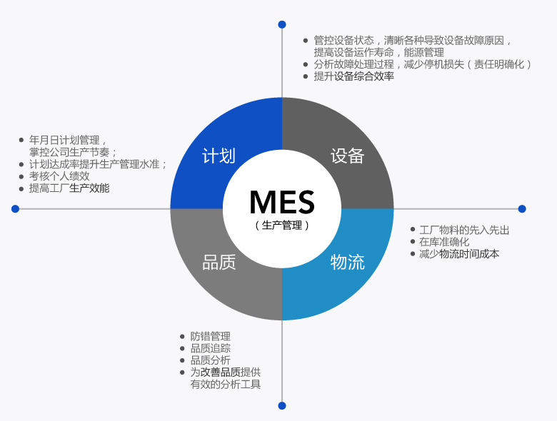 管理生產活動的所有行為,包含 生產計劃,生產實績,生產工藝,品質管理,品質追蹤,設備管理,倉儲管理,能源管理等;